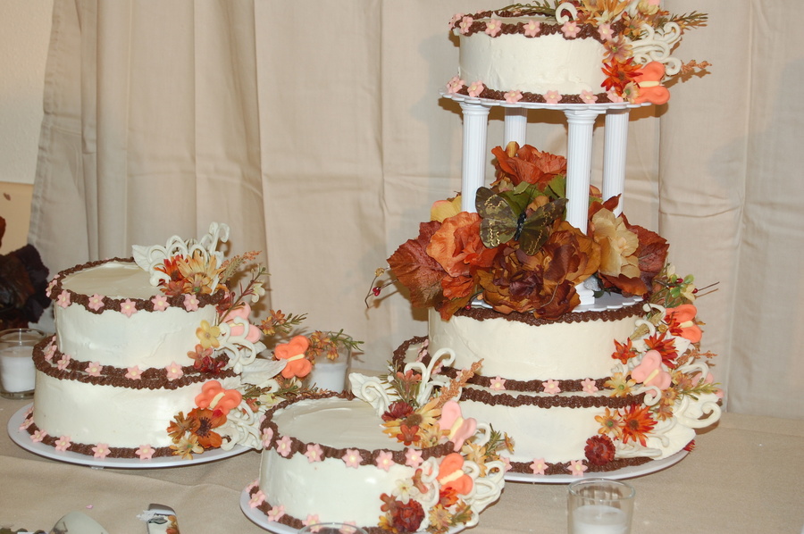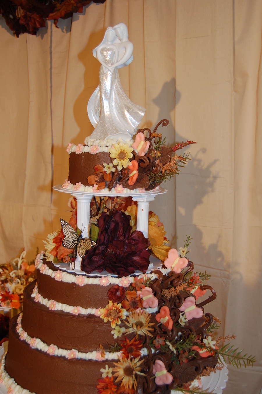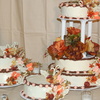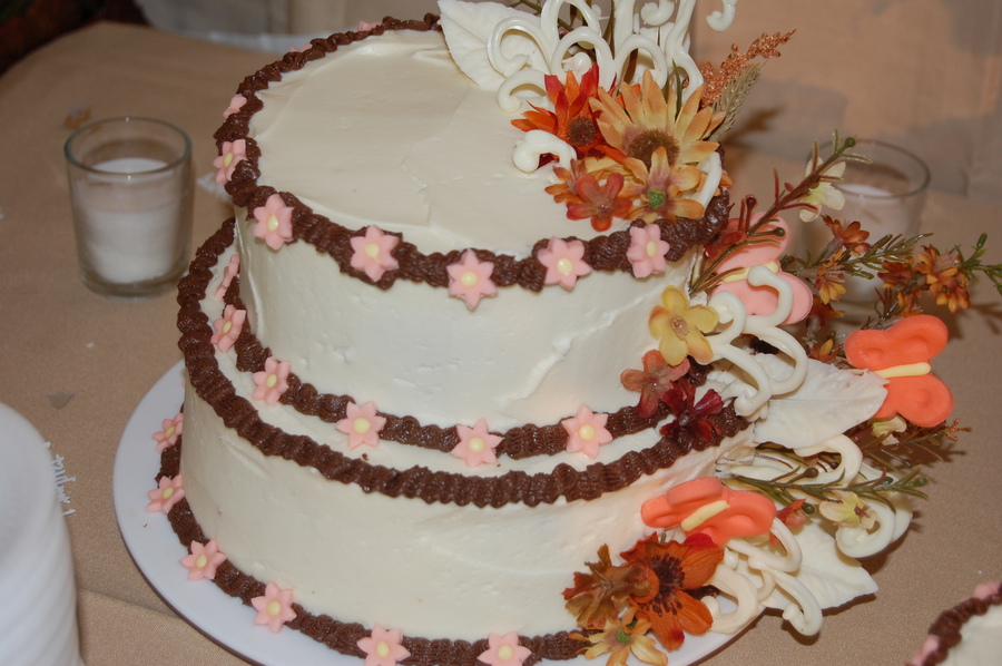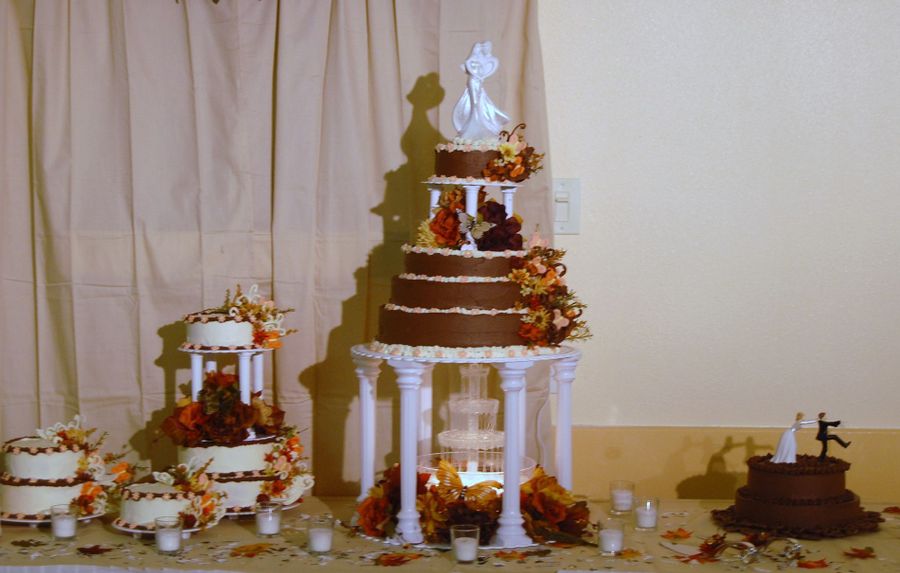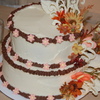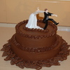 This was my son's wedding in november. The first wedding cake I ever made. They wanted a chocaolate cake with chocolate butter cream icing we also used side cake reversed with almond butter cake and white icing! I used melted chocolate to make chocolate leaves and scrolls with white chocolate on the side cakes.