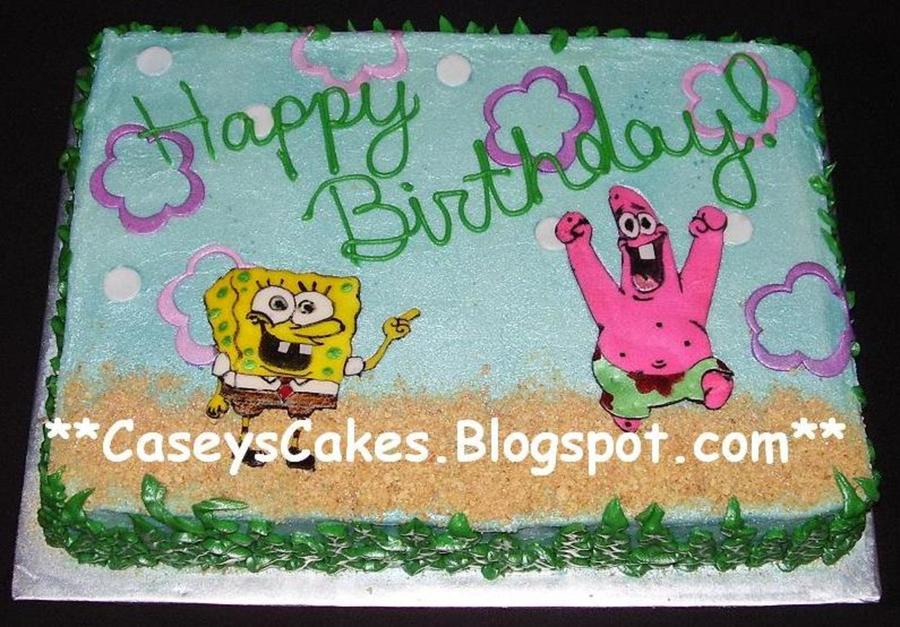 9"x13" sheet cake 1/2 white 1/2 chocolate. Vanilla Butter Cream icing with fondant characters & accents. Graham cracker "sand" & butter cream seaweed. Sponge Bob & Patrick are both hand painted