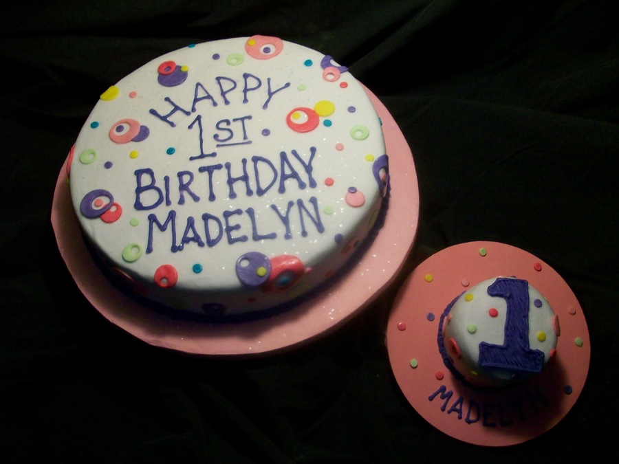 Buttercream icing with mmf dots and circles. Smash cake to match. Thanks for looking