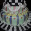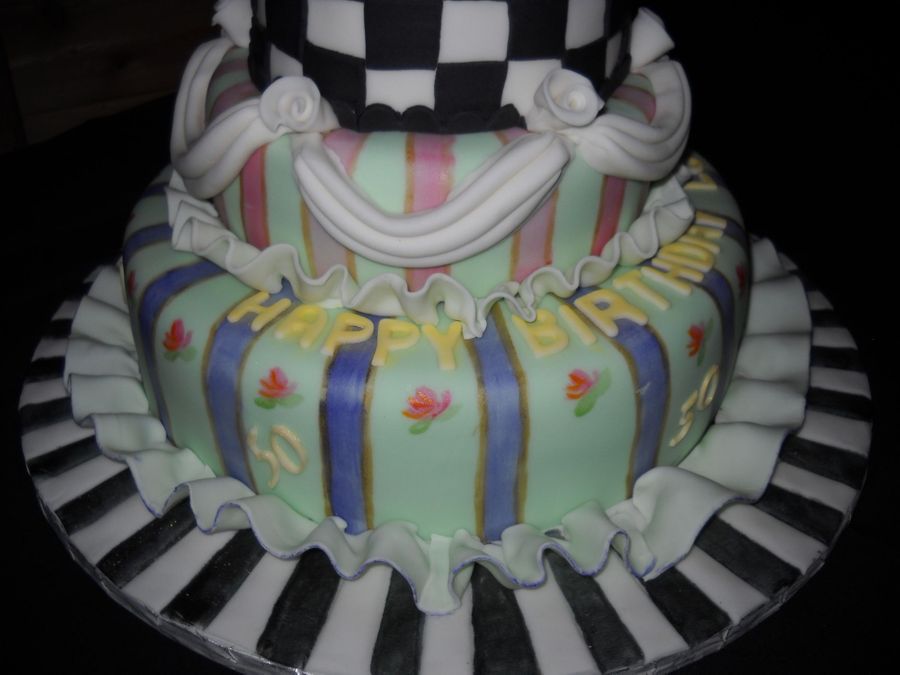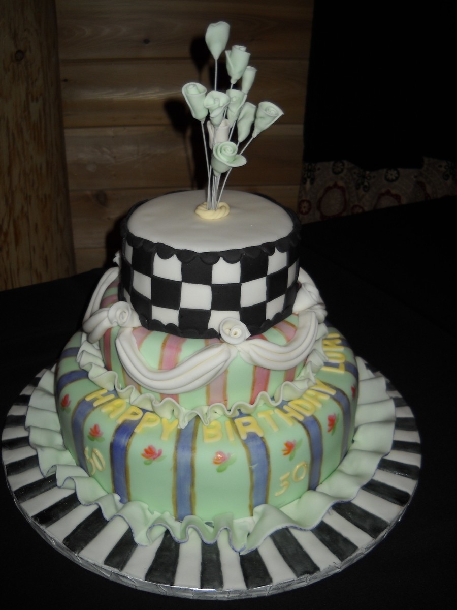 Tiered red velvet cake, cream cheese filling, fondant covered birthday cake for a beautiful lady turning 50. Fondant and gumpaste accents and colors were chosen to match her collection of Mackenzie Childs kitchen ware. Flowers and ruffles were 50/50 fondant -gumpaste. flowers and stripes on the cake were hand-painted.