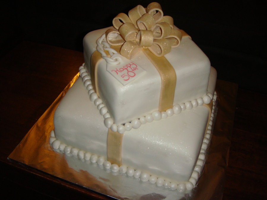 This was a couple presents for a 50th birthday party. The top bow is gumpaste and all fondant is MMF. Everything was covered in luster dust. TFL!