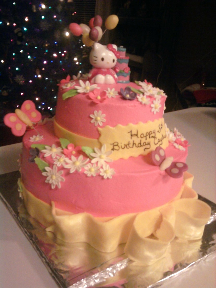 Hello Kitty cake with fondant accents, gumpaste flowers, modeling chocolate balloons and butterflies.