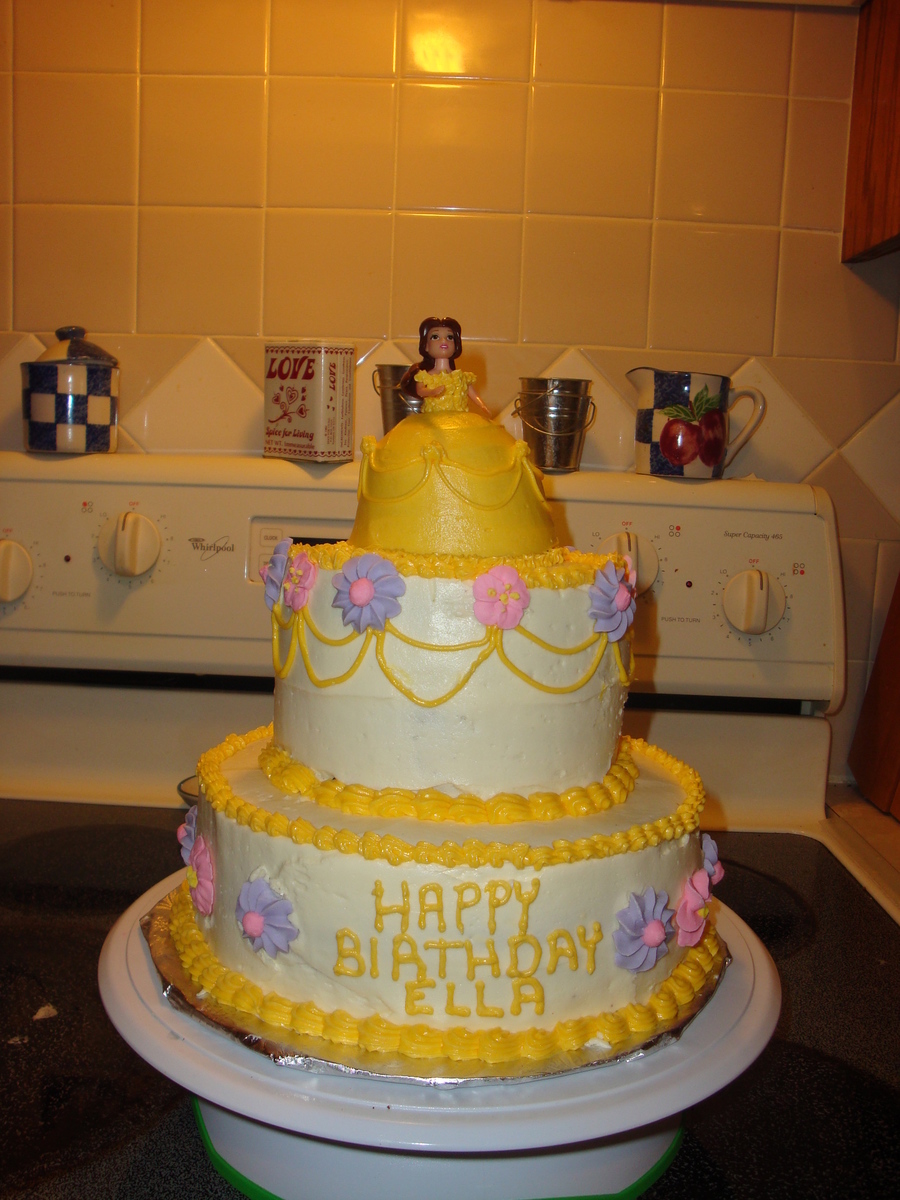 2 tier cake with mini wonder pan as belles dress. royal icing flowers, little belle doll
