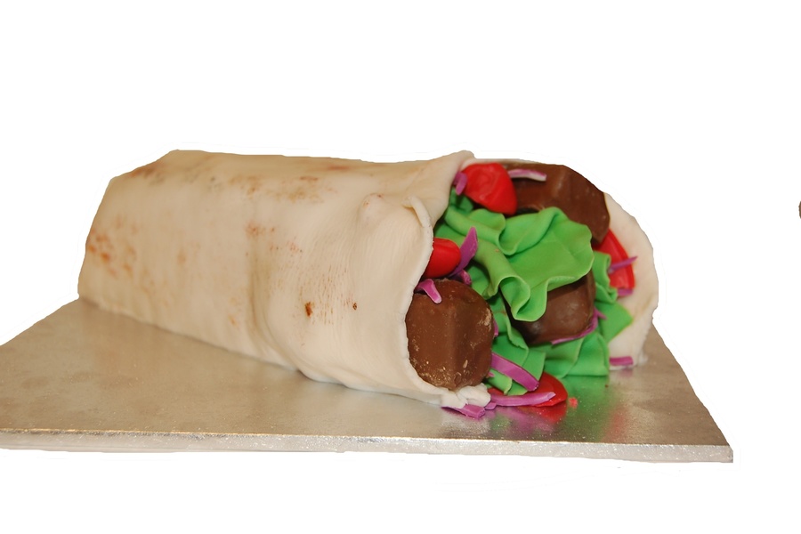 This was made for a guy at work who loves souvlakis. It is a white chocolate mud cake wrapped in ivory fondant with fondant lettuce, tomato and onion and honeycomb blocks as the meat.