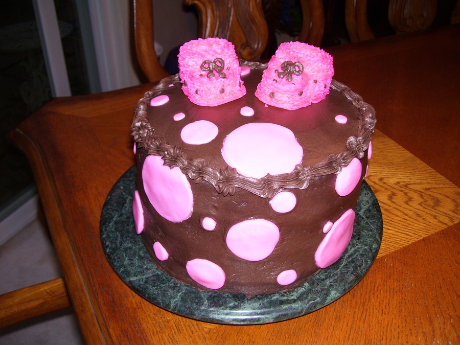 Strawberry cake with strawberry filling with dark choc. buttercream. Cupcake & buttercream booties. First attempt at the booties but not to bad ( DD requested them) This is the top tier of the cake. Never got picture of bottom tier or completed cake :(. Polka dots were rolled buttercream. TFL