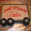 White 12x18 carved to be the cab; 12x18 white "trailer" layered and half filling with rasp/other half filled with mousse. Gumpaste accents. TFL!