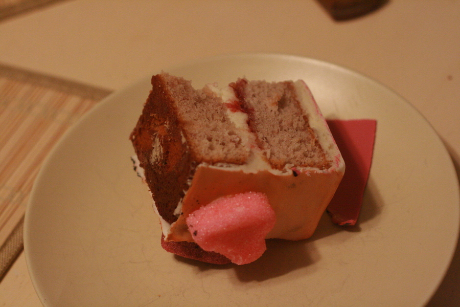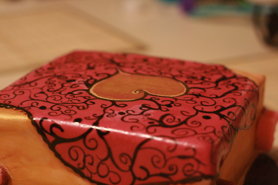 This was just a fun cake that I made with my four year old daughter. It was supposed to have a six inch round second tier, but she stole it to do herself. She did a great job on hers though. The cake is raspberry vanilla filled with butter cream, raspberry preserves, and white chocolate chips. The top is hand painted, and brushed with super gold. This was fun and yummy! Oh, and the little hearts are pressed sugar and were supposed to go all the way around, but they too got nabbed for The little cake :)