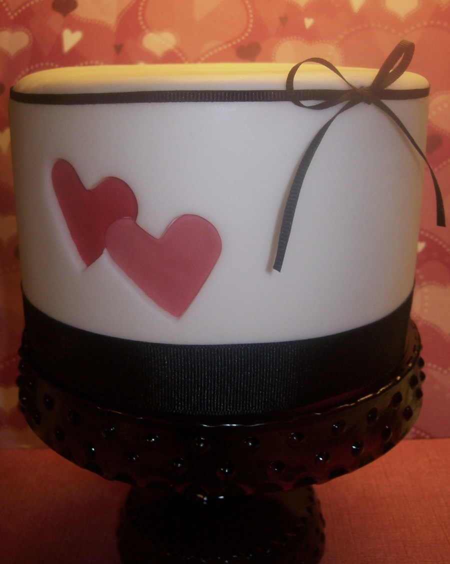6" display cake for Valentine's Day. All fondant with cut out hearts and gross grain ribbon.