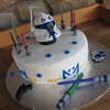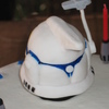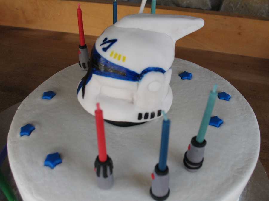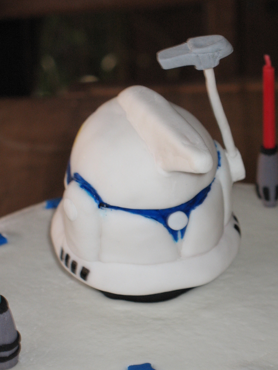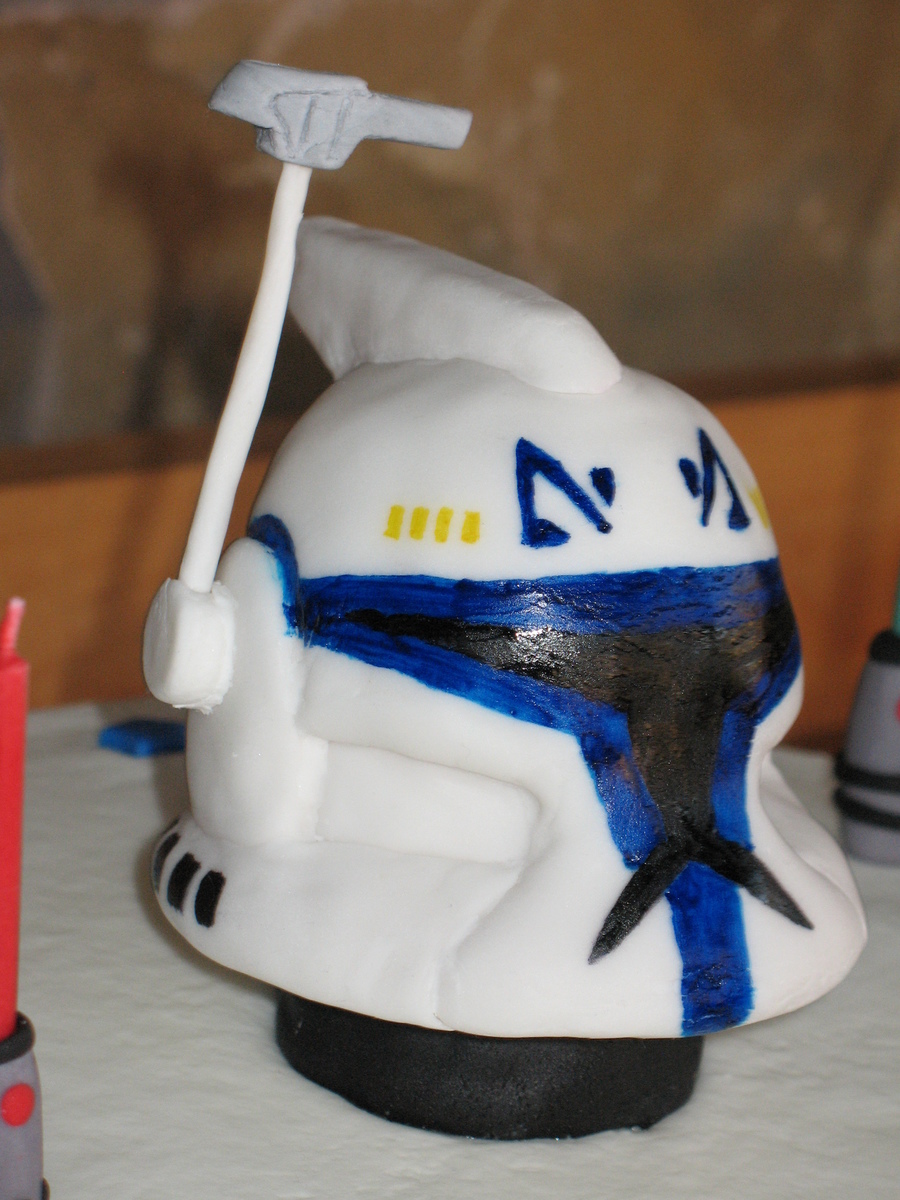 I was happy to be able to surprise my niece with this Captain Rex cake, her favorite character from the Clone Wars series. It's a chocolate cake iced with BC. The helmet is RKT covered in fondant and handpainted while the antenna is gumpaste. All other decorations are fondant. I found candles that flame the same color as the wax so I decided to turn them into light sabers. This cake was a blast to make. TFL!