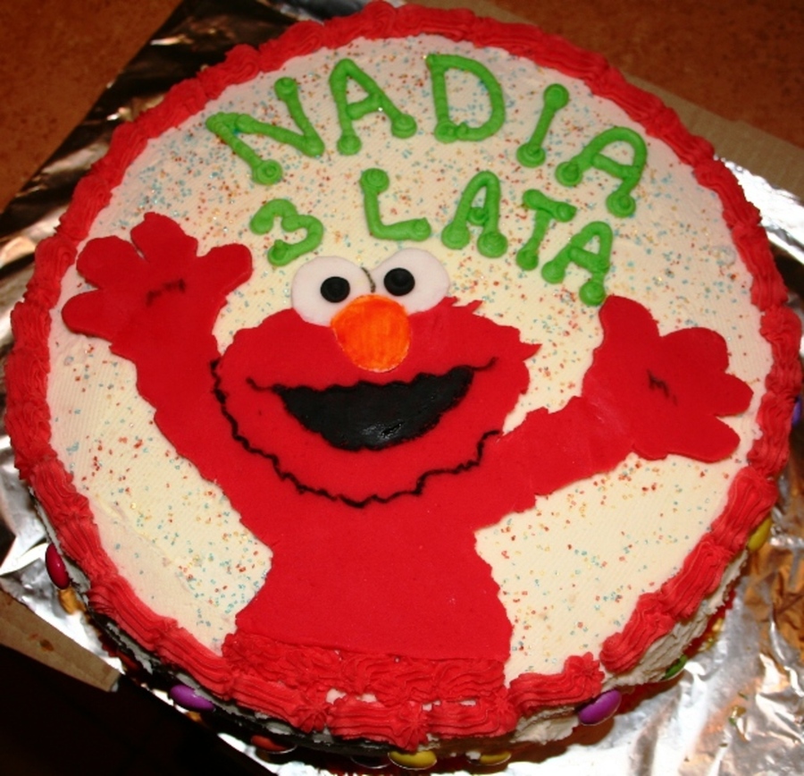 Fondant Elmo, buttercream icing, Smarties on the sides.