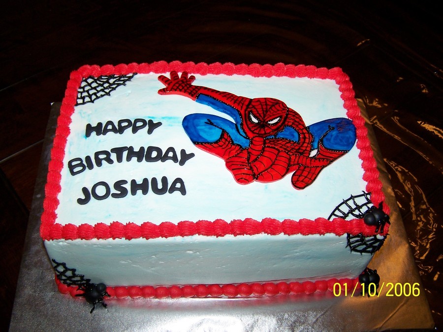 9 x 13 chocolate cake with butter cream icing. Fondant cutout of spiderman hand painted with food colors; not to shabby for my first attempt at freehand.
