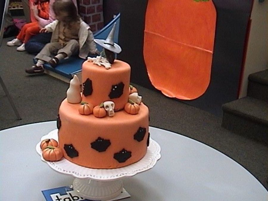 2 tiered cake with pumpkins, bats, ghosts, skulls,bones and a witch's head on top.