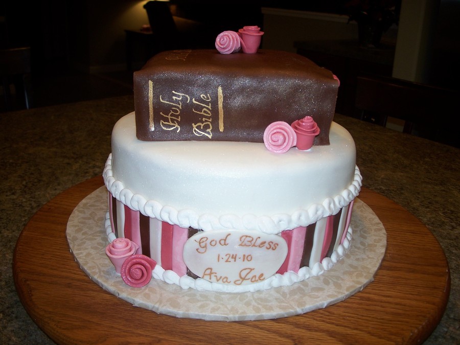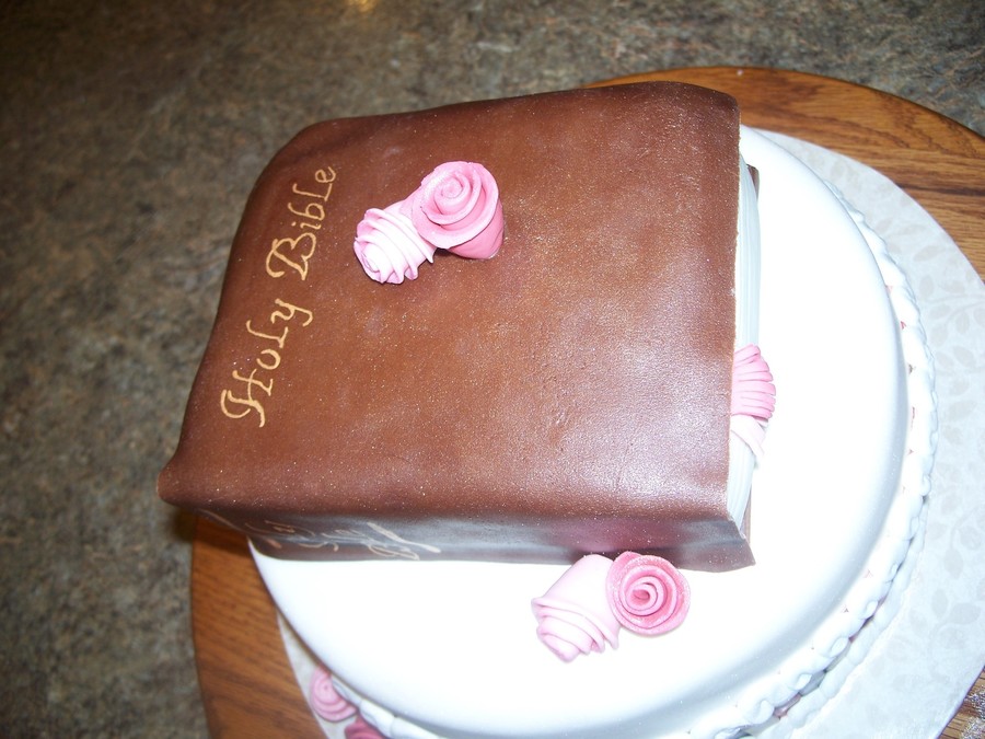Three layer bottom tier, covered in fondant. Bible is 2-layer chocolate, covered with chocolate fondant. Inspiration from picture from client.