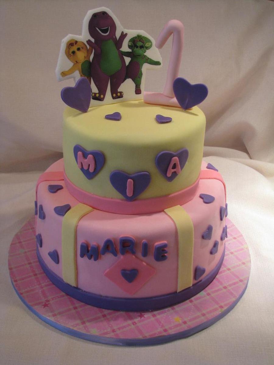 A simple cake for a baby's first birthday who adores Barney