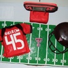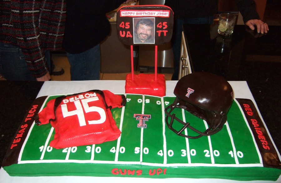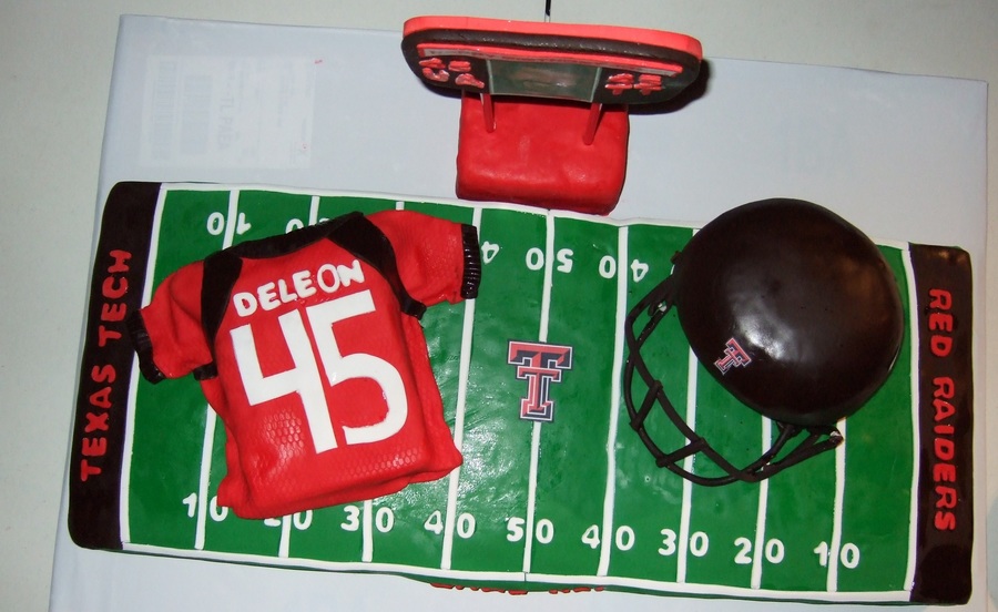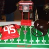 This cake gave me some problems. The helmet was a fiasco, but it was my first one and I know the next one will be better. The face mask broke when I attached it to the helmet, and I had a hard time carving the helmet the way I wanted. Because this cake was 2 flavors, I had to attach 2 cakes together to make the field and there is an obvious dip, as you can see. Oh, well, the birthday boy was so happy to receive it, so that makes up for my disappointment.