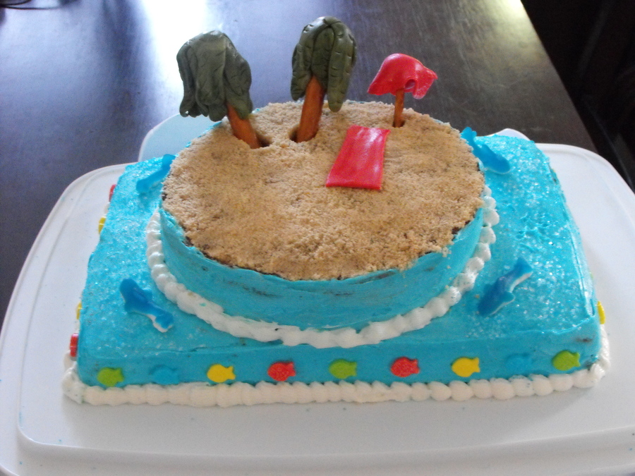 My mother had wanted to be somewhere tropical for her 50th birthday - so I brought the beach to her! She <3 it! Devil's foodcake with vanilla icing and my mom's favorite, blue gummy sharks! Fondant and pretzels for the trees. Umm.... white fondant really needs a lot of red food coloring. I learned that. I didn't have the patience to get to red.