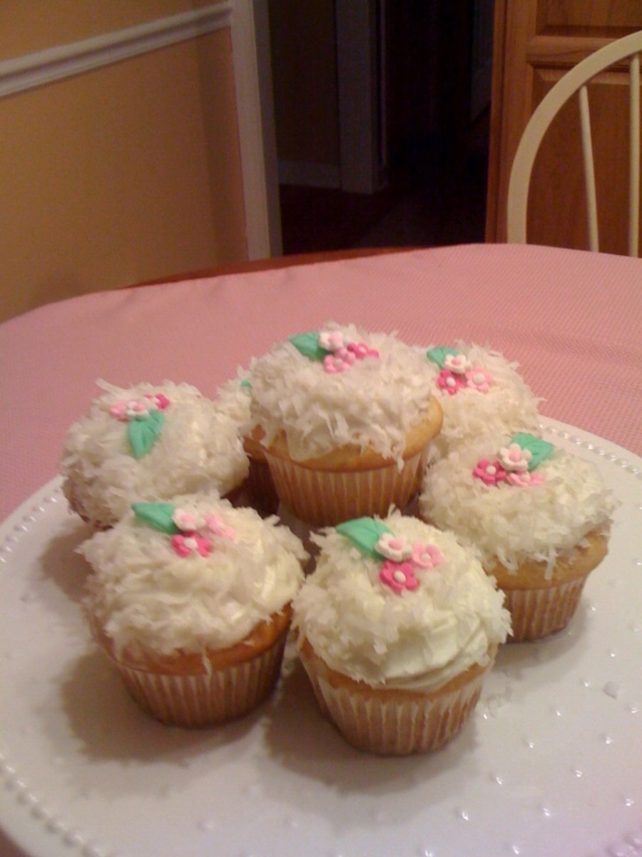 Coconut cupcakes with white chocolate and coconut frosting, gumpaste accents.