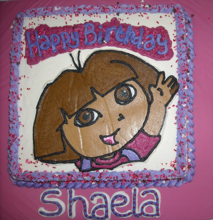 FBCT Dora the Explorer on cream cheese icingand strawberry cake.