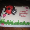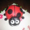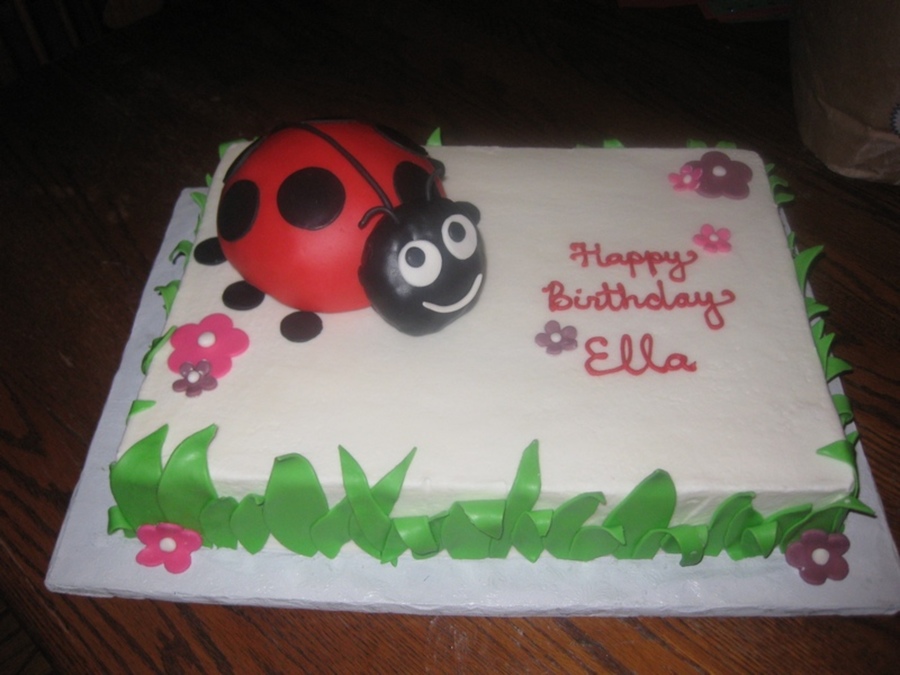 For a 1 year old. 11x15 yellow with strawberry conserve. The ladybug is 1/2 of the ball pan, and the head is carved from a mini-doll pan form. MMF covered both head and body, flowers and grass.