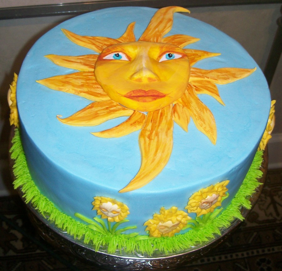 buttercream, with molded mr sun face, fondant rays, and molded flower faces
