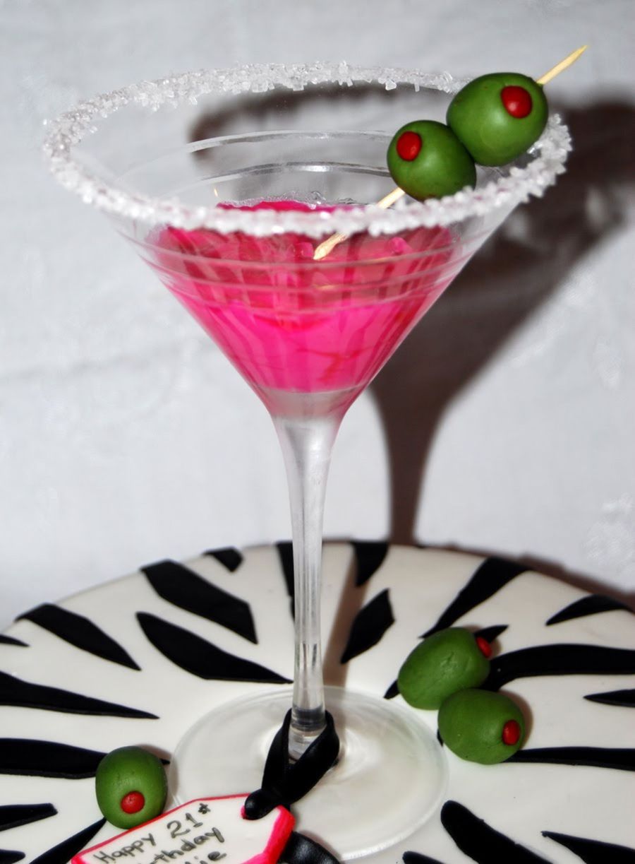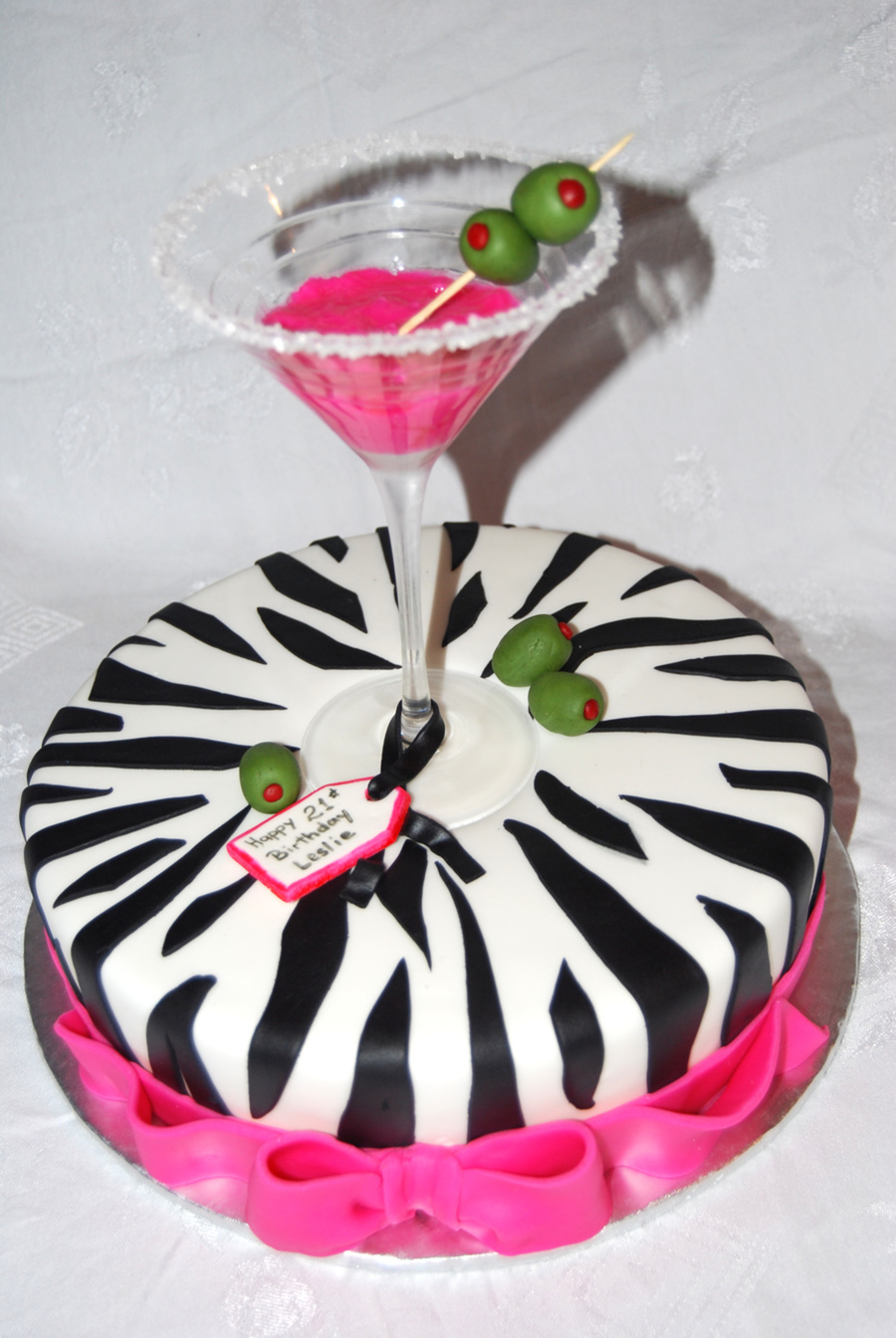 The client's daughter was turning 21 and she liked zebra print and hot pink. pink drink is royal icing with some piping gel on top to make it look moist. Olives, tags and bows are all MMF. The flavor of the cake was my specialty rum cake.