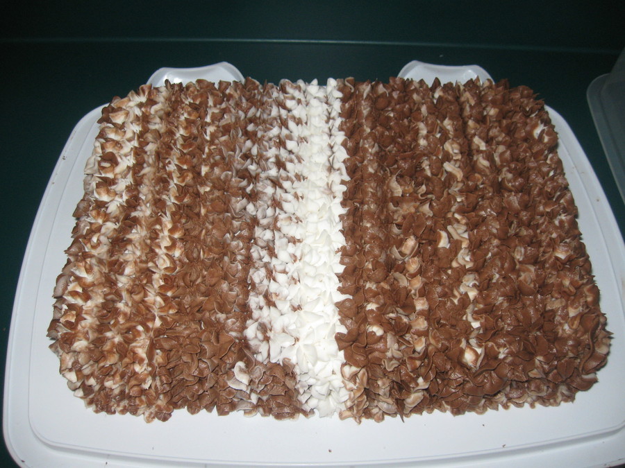 Made this cake real quick for my hubby's work potluck. Was trying to do half/half chocolate and vanilla buttercream.
