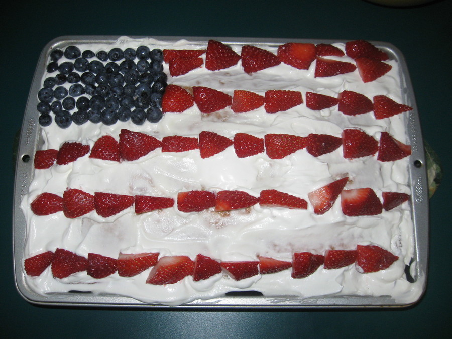 Traditional July 4th cake made with 50 blueberries and strawberries. Vanilla cake with whipped topping as the frosting, topped with fruit.