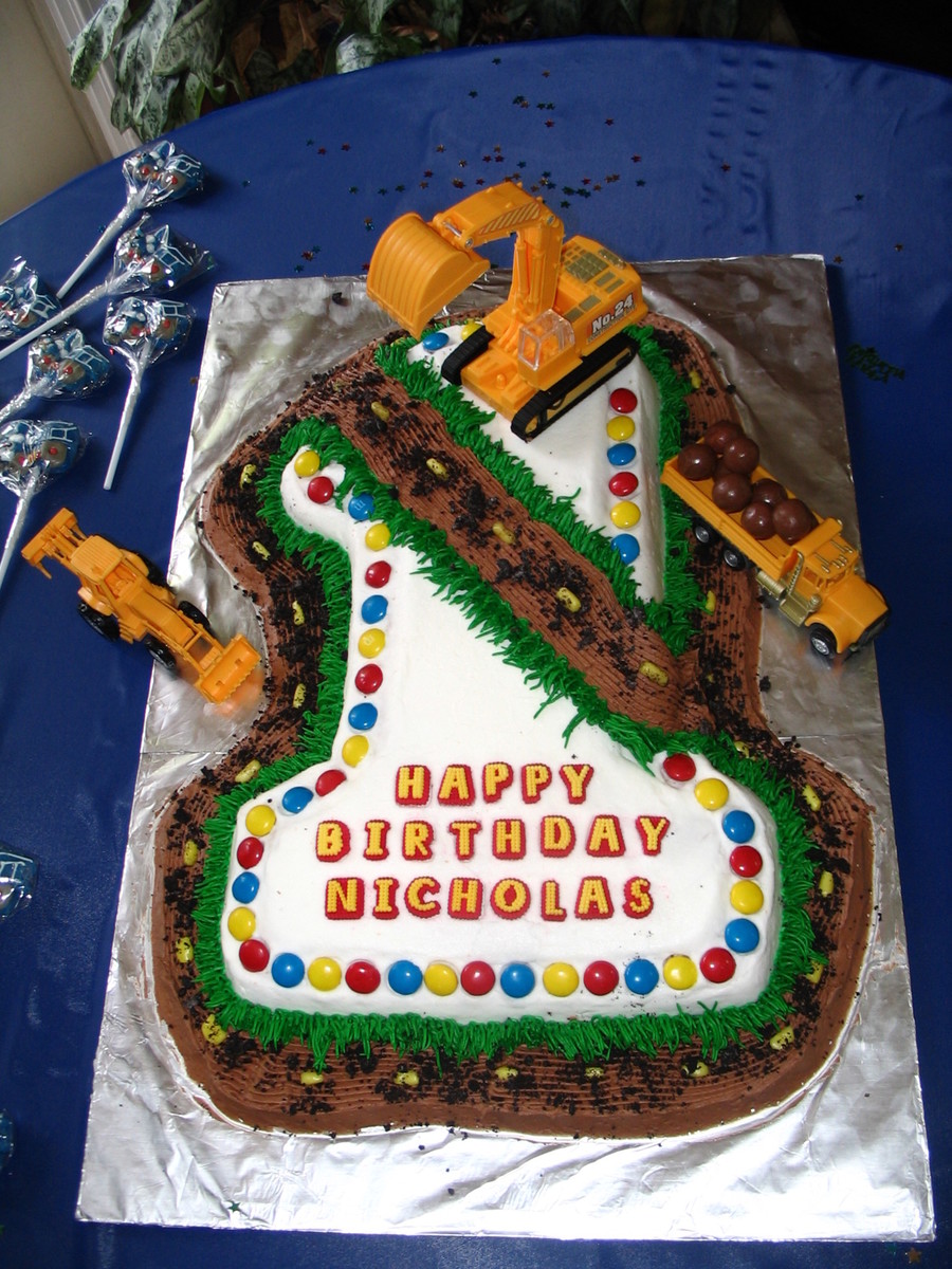 #1 character pan covered with buttercream frosting, crumbled oreo cookies, M&M's, and whoppers.