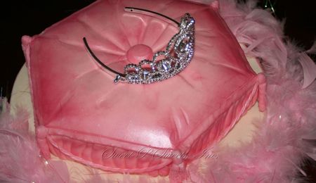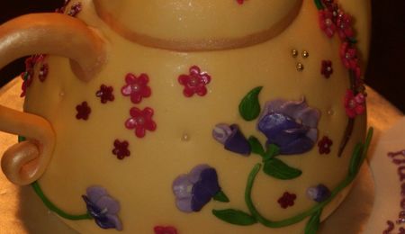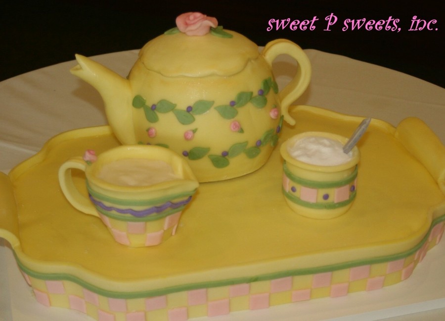 This tea set cake was created to match a teapot bridal shower invitation. The tray and teapot were cake and the creamer and sugar bowl were crispy treat covered with candy clay. TFL!