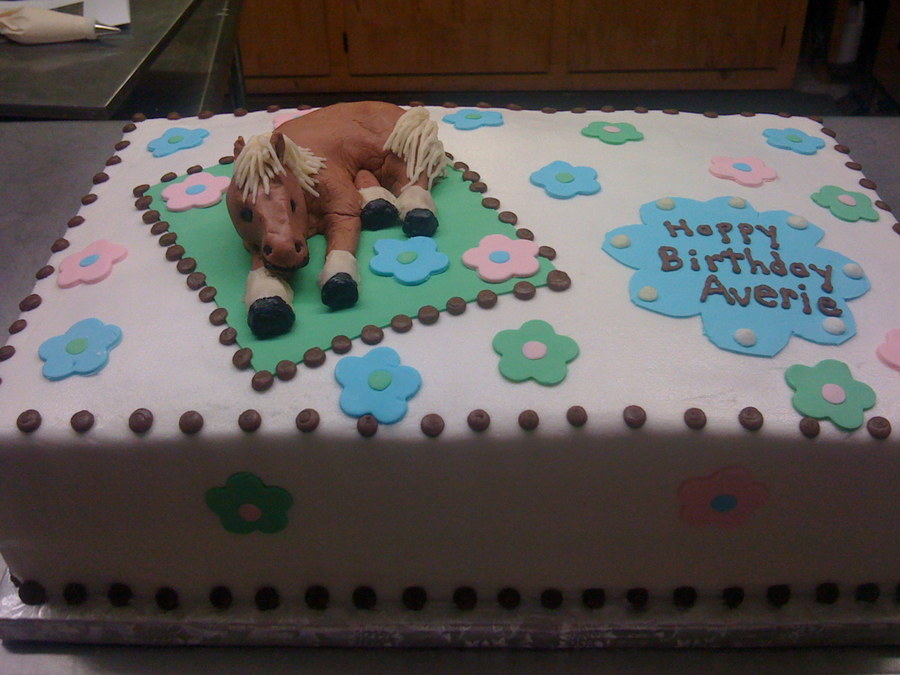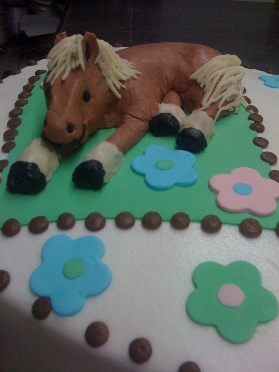 12 x 18 cake with molded fondant horse. Details are in fondant, buttercream icing. First attempt at molding a figure.