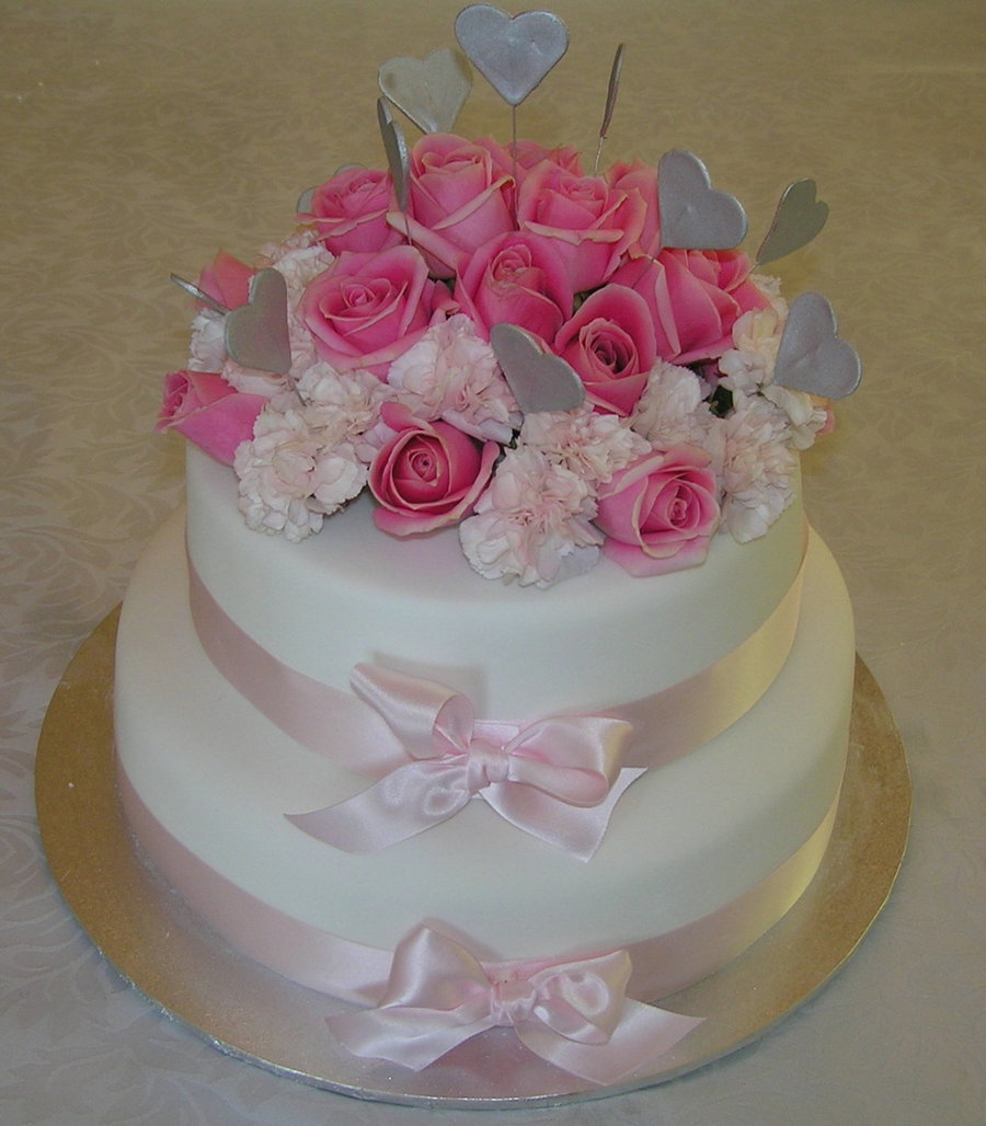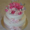 I made this cake fas a gift for a work friend trying to have a quick wedding before the birth of their first child. It is butter cake and chocolate cake covered in marzipan and white fondent with fresh flowers that matched their table decorations.