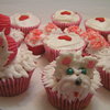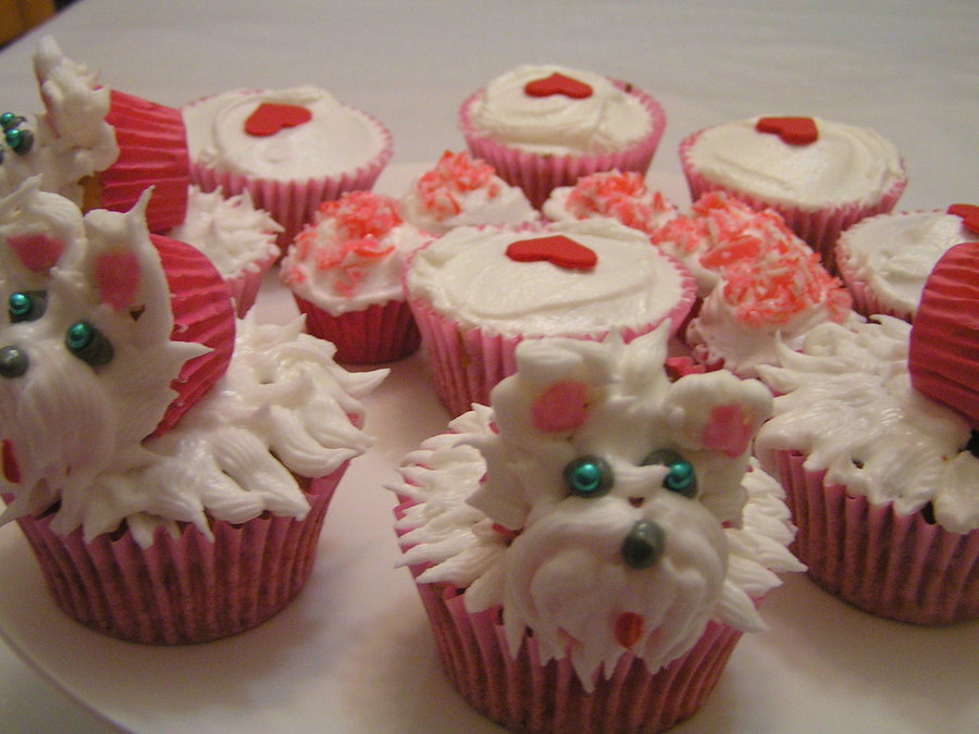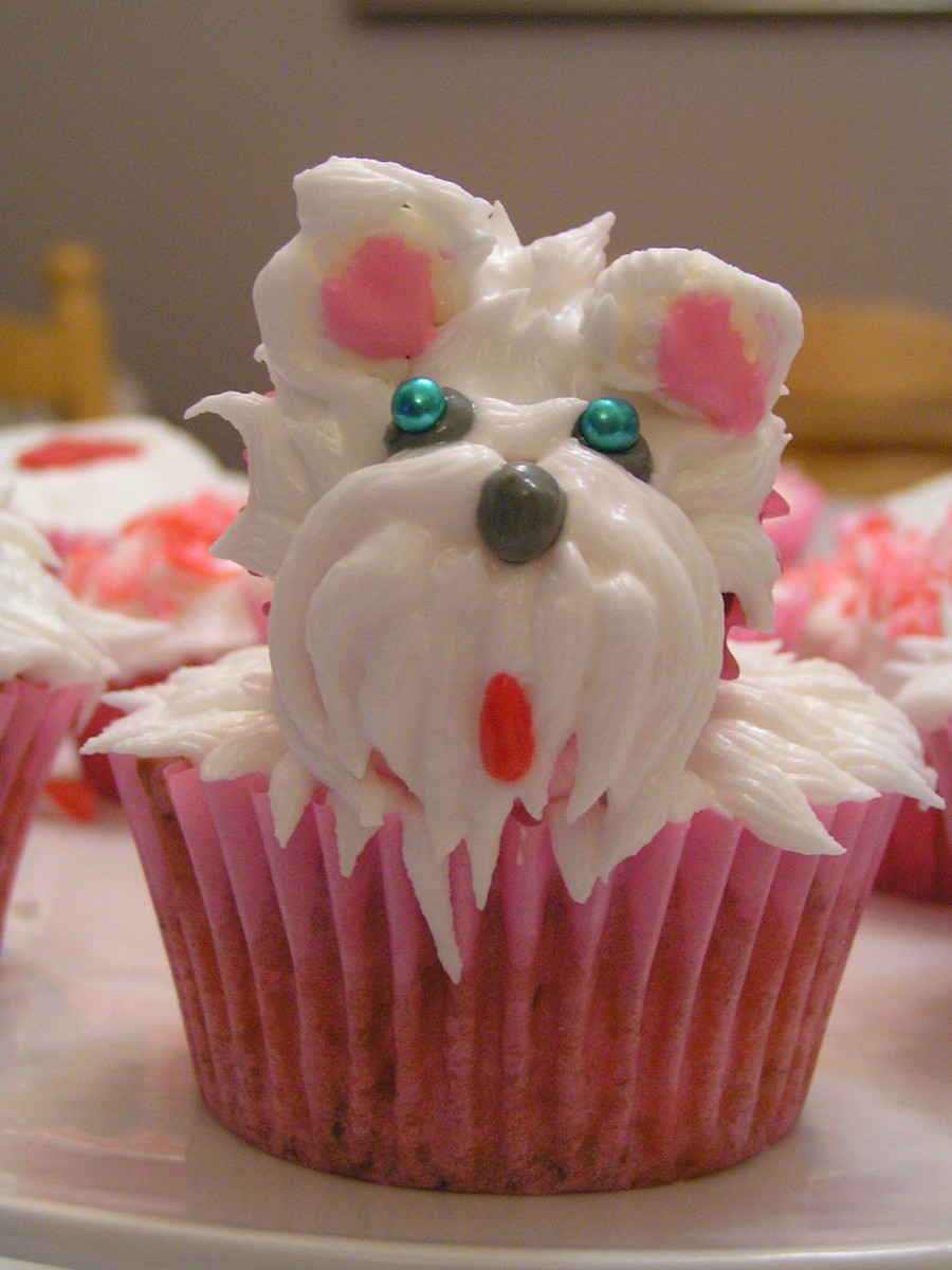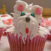 My daughter saw a similar picture and challenged me to make a terrier cupcake. I was inspired. This is one muffin size and one mini cupcake, piped with royal icing and blue cachous for eyes.
