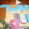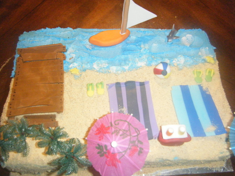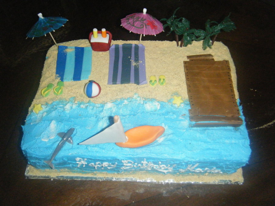 Pina Colada cake with filling. Buttercream frosting with gramcraker sand. Fondant accents except for the palm trees, beach umbrellas and dolphin.