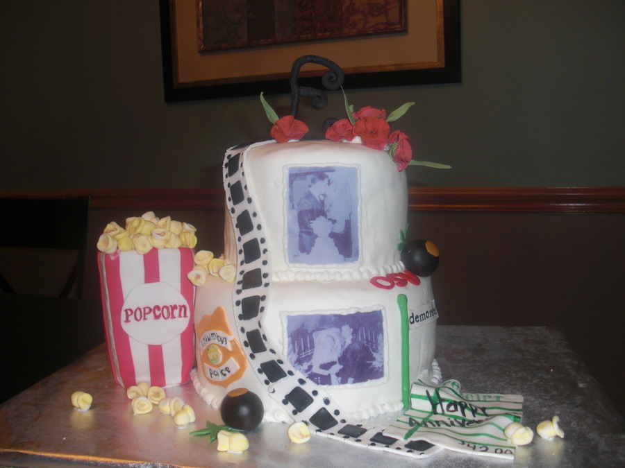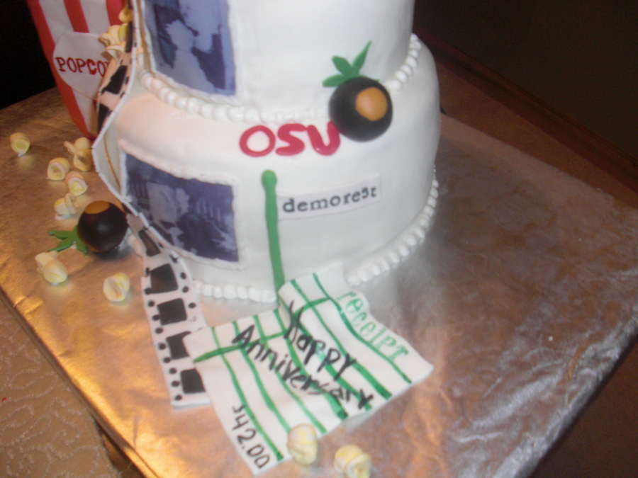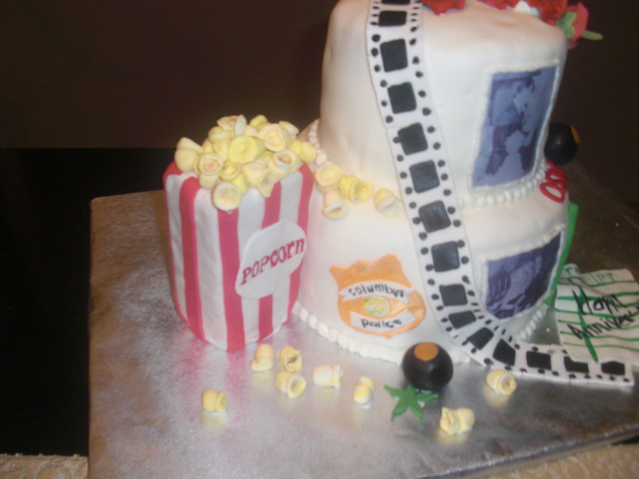 This was a 42nd anniversary cake. She was a waitress, he is a police officer. The first street they lived on, they like OSU football, Love movies, favorite color red, favorite flower is carnations. The picture are original wedding. They wanted on there.