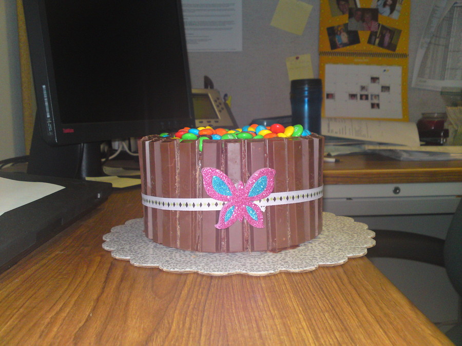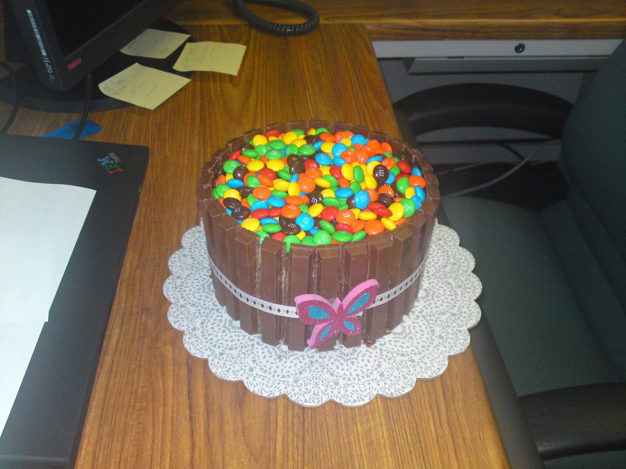 This was for a co-workers birthday...She loves candy! 6in. round Chocolate-cavity-maker cake with chocolate icing!