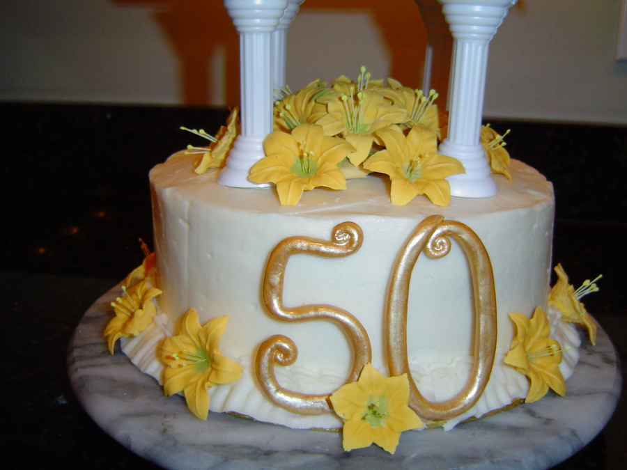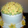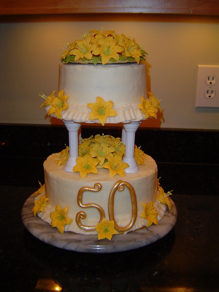 This is the cake I made for cake class "re- dressed" for my neighbors anniversary. It is carrot cake with cream cheese frosting. Decorated with royal icing Lilly that I just learnt in the Wilton course 3 class.