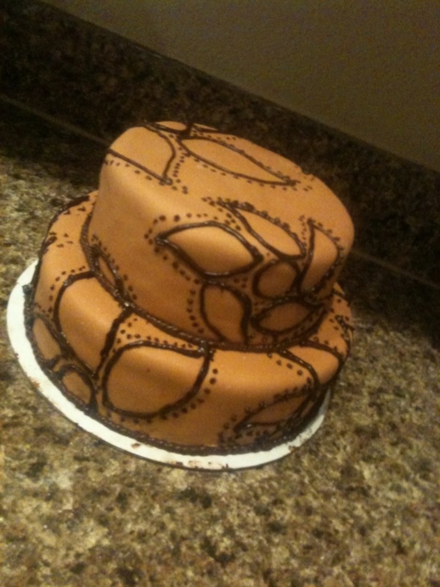 Chocolate cake with caramel filling and chocolate buttercream frosting, covered with fondant, chocolate buttercream detail.