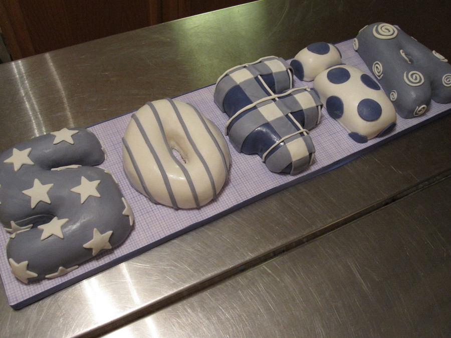 I love when customers come up with new ideas. A friend asked me to make his daughter's 1st birthday cake... He said, "I don't know if you can do this but we were thinking maybe having individual cakes spelling out our daughter's name, with like, a different pattern on each cake." Me, "NO PROBLEM! I THINK I CAN DO THAT." And it turned out even better than I thought it would. All fondant and carved from (2) 9x13" cakes. Thanks for looking!