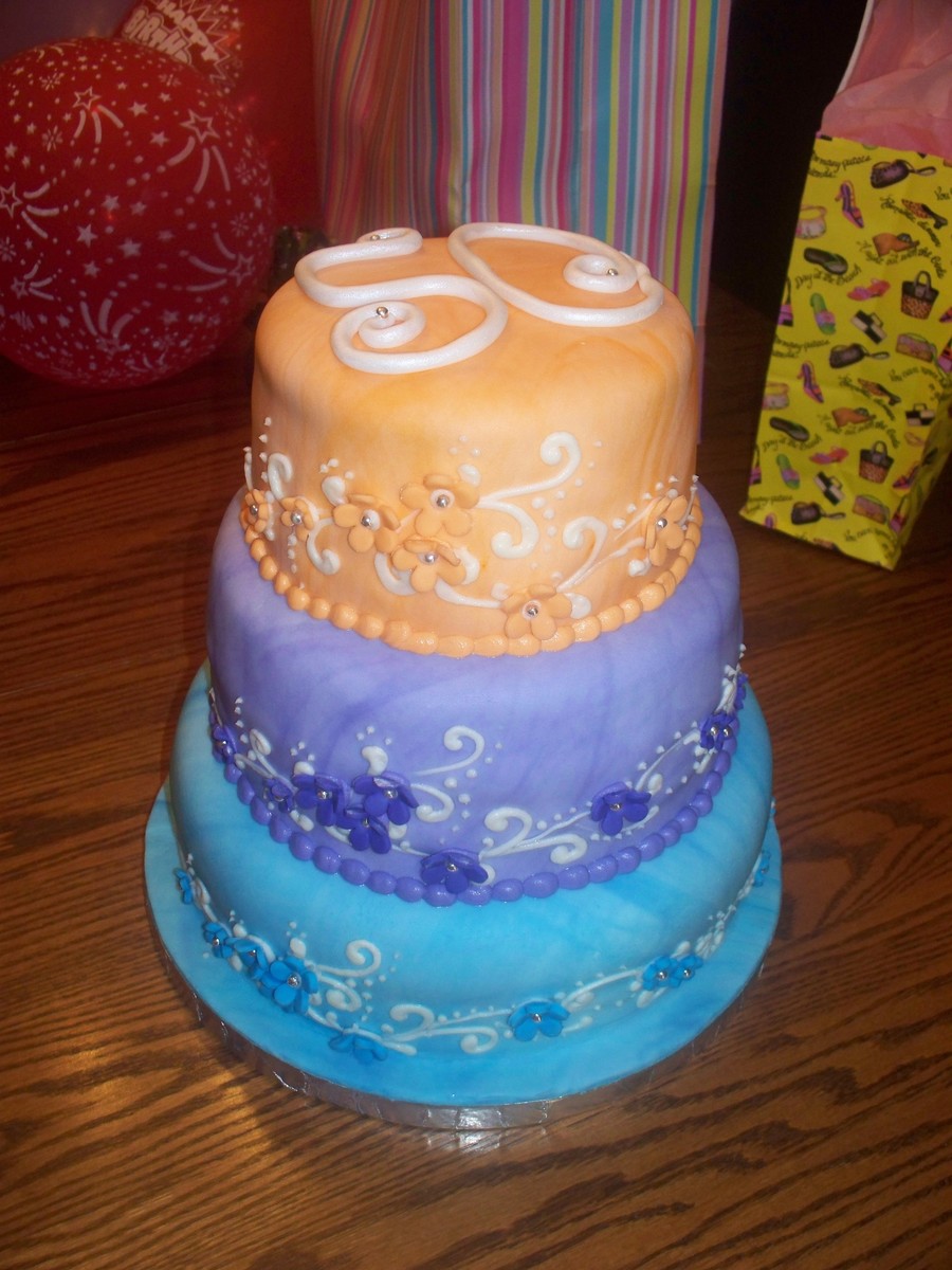 3 tiered white with lemon filling and vanilla buttercream, covered in fondant with buttercream piping.