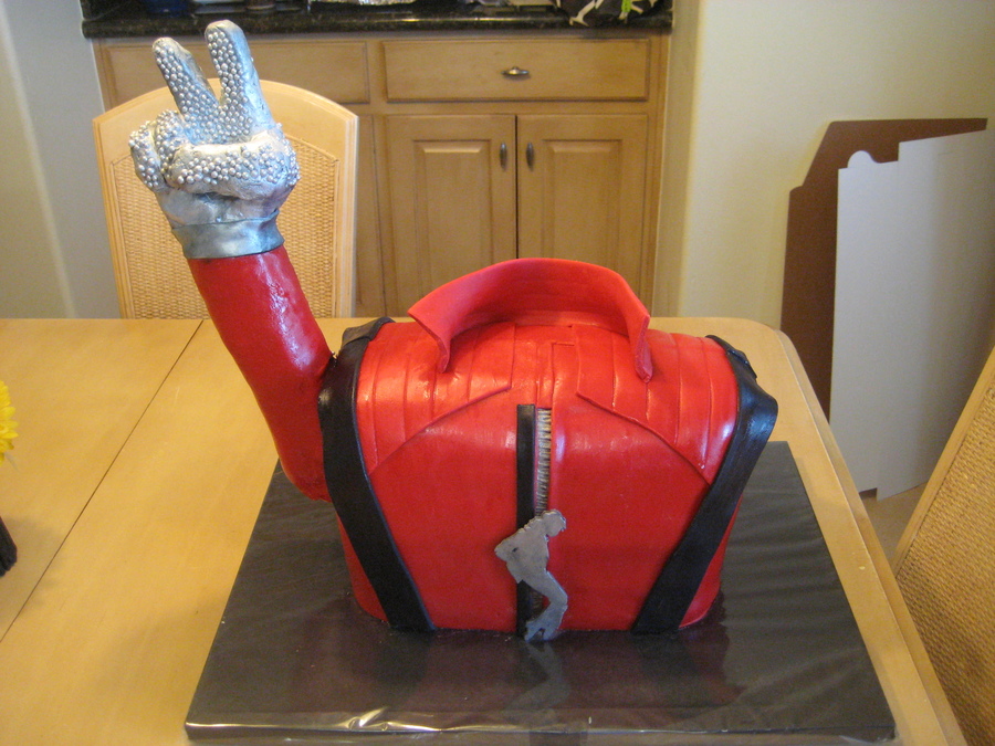 Banana cake with banana mousse filling and frosted in white chocolate ganache and then covered in mmf. Arm and hand were carved from styrofoam.