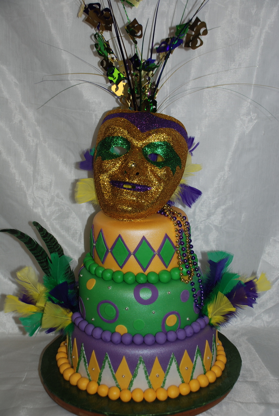 This was for my great niece's 16th birthday party. It was a Mardi Gras themed party. The bottom tier was white cake with chocolate buttercream filling, the middle tier was white cake with strawberry buttercream filling and the top tier was white cake with buttercream filling. All covered in MMF then Mardi Gras decorations added. TFL