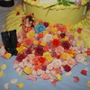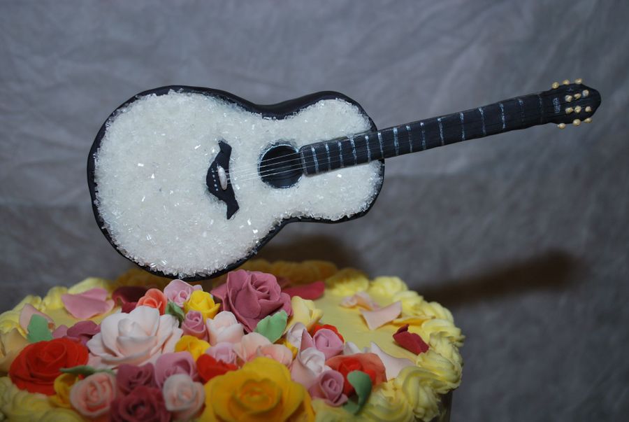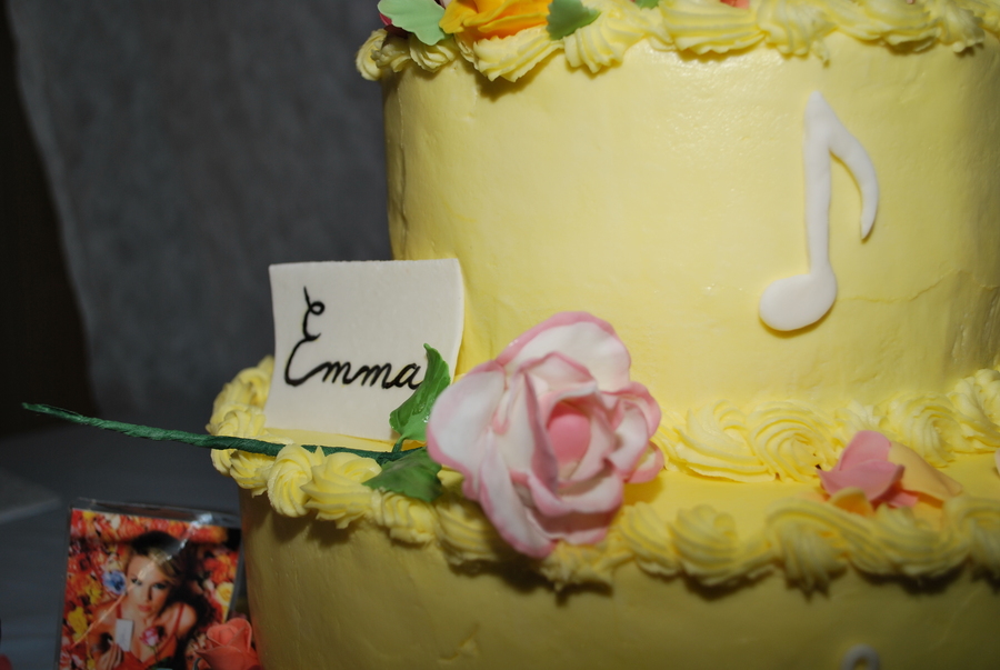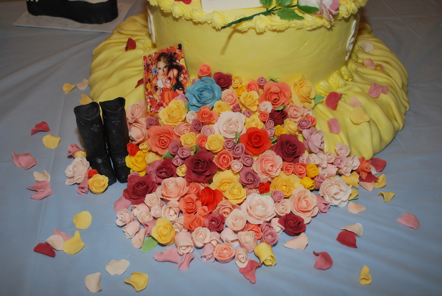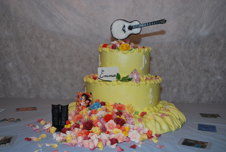 Created for my granddaugher's 6th birthday. Tough cake to design, didn't want just a guitar cake. Themed after "Our Song" video. Guitar on top represents Taylor's rhinestone guitar creation, but done using clear sugar crystals. Two tiers are iced in buttercream icing. Cake platform is an upside down round pan on a board surrounded with plastic wrap then draped in fondant to look like fabric. Flowers, boots, note, and roses are made out of 50/50 fondant/gumpaste mixture.