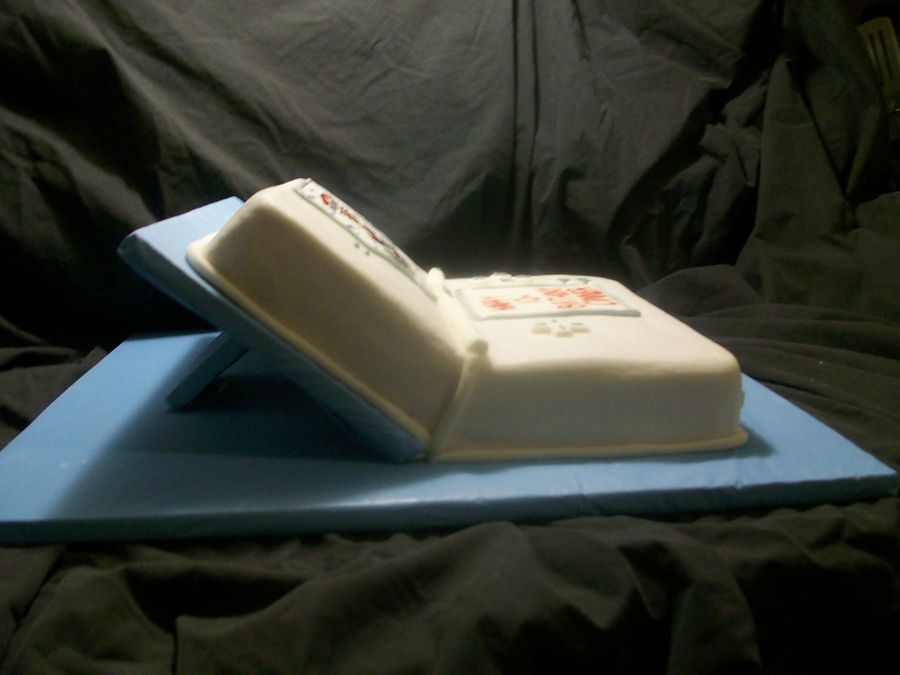 here is my version of a nintendo ds cake. the cake is made from a 12" square. I tried my best to rig up the cake board to get the angle. Covered in buttercream icing with mmf accents. Thanks for looking.