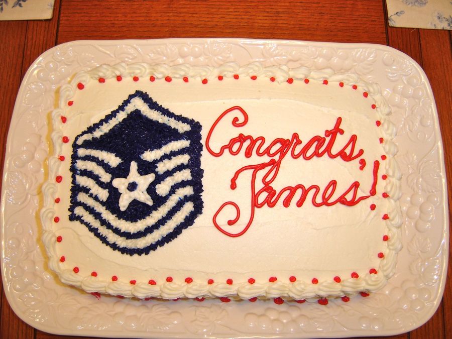 One of my earlier cakes for my husband's promotion to Master Sergeant. I have since learned the gel transfer method, which would make the stripes come out perfectly symmetrical.