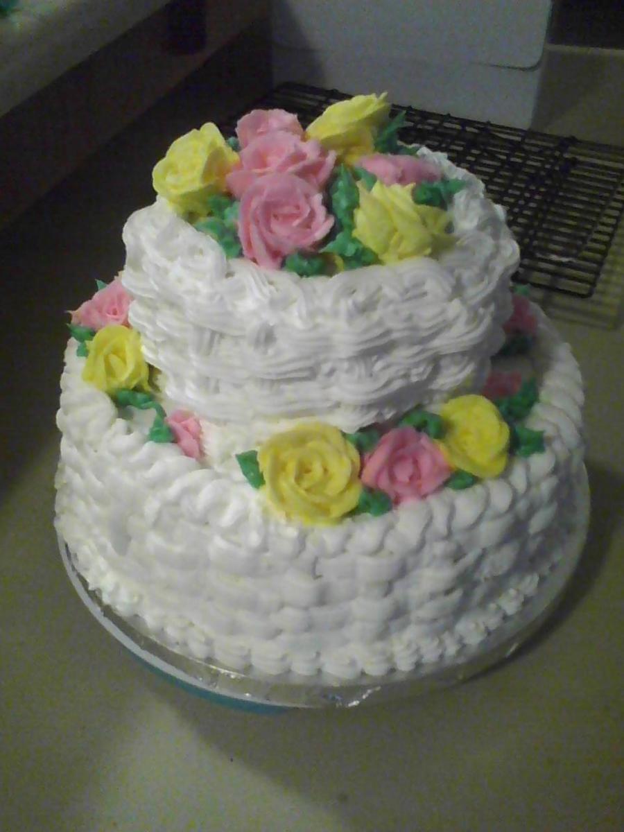 2 tier white almond sour cream cake with butter cream frosting. My husband came home from work and said he needed a cake for Monday. This is what I came up with.