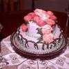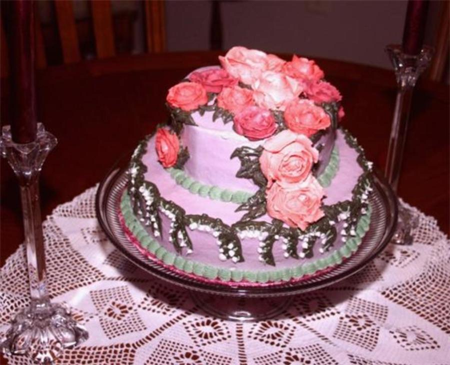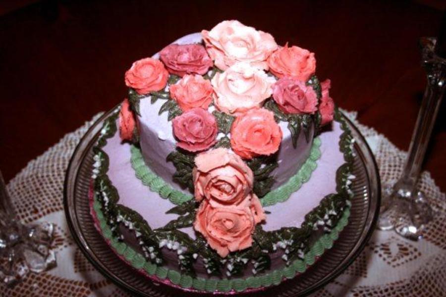 9" and 6" cakes with BC frosting roses. Roses are darking shades of pink.