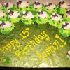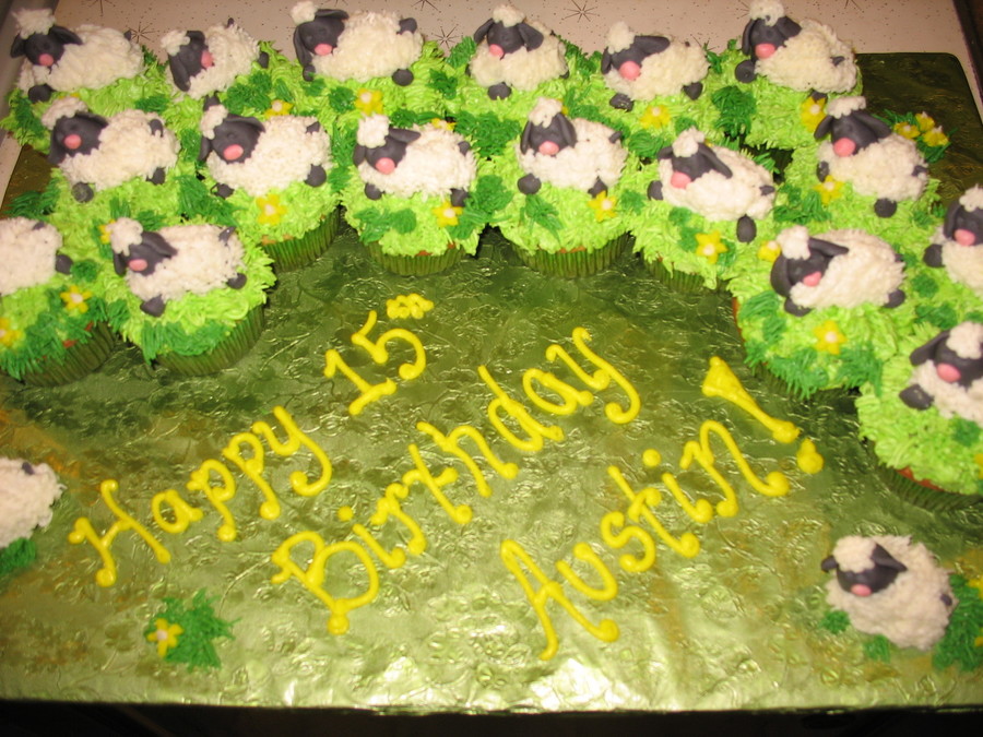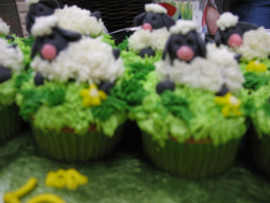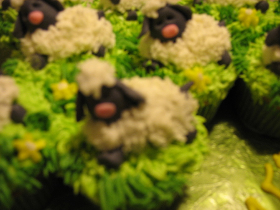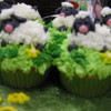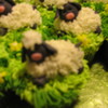 White Cake with Almond Buttercream Icing grass. Sheep are made of MMF and wool is buttercream frosting.