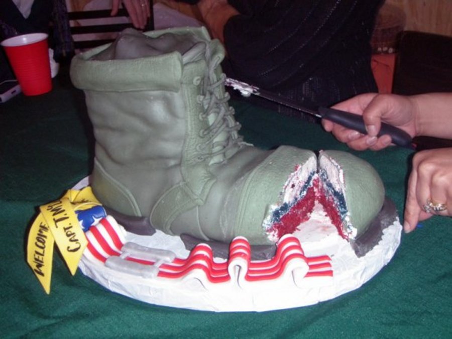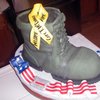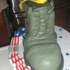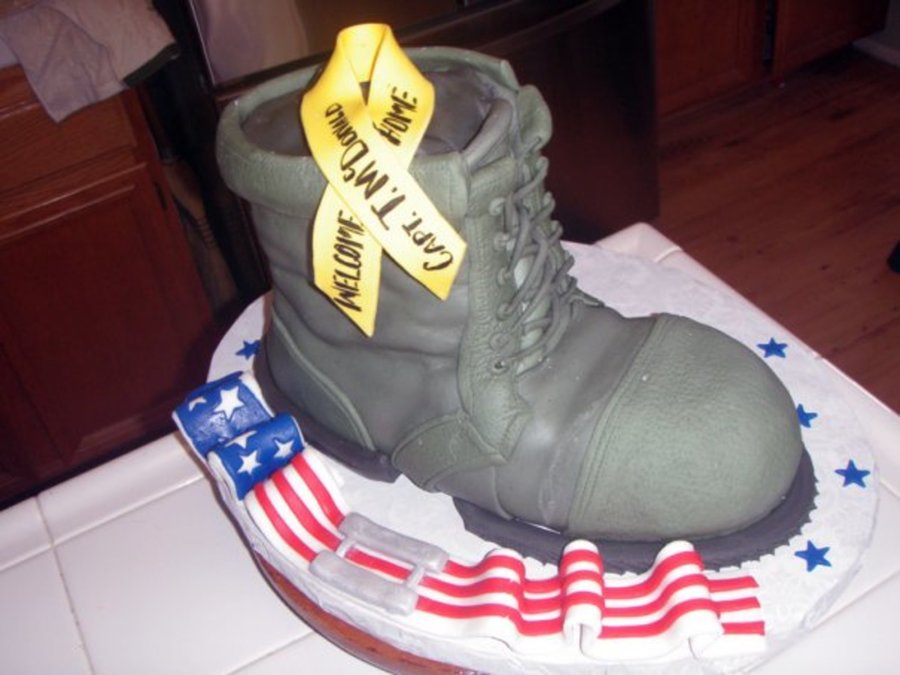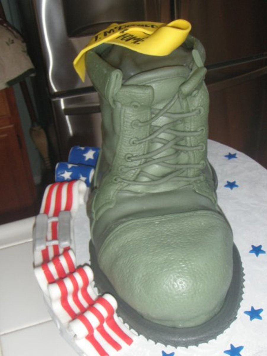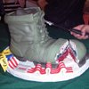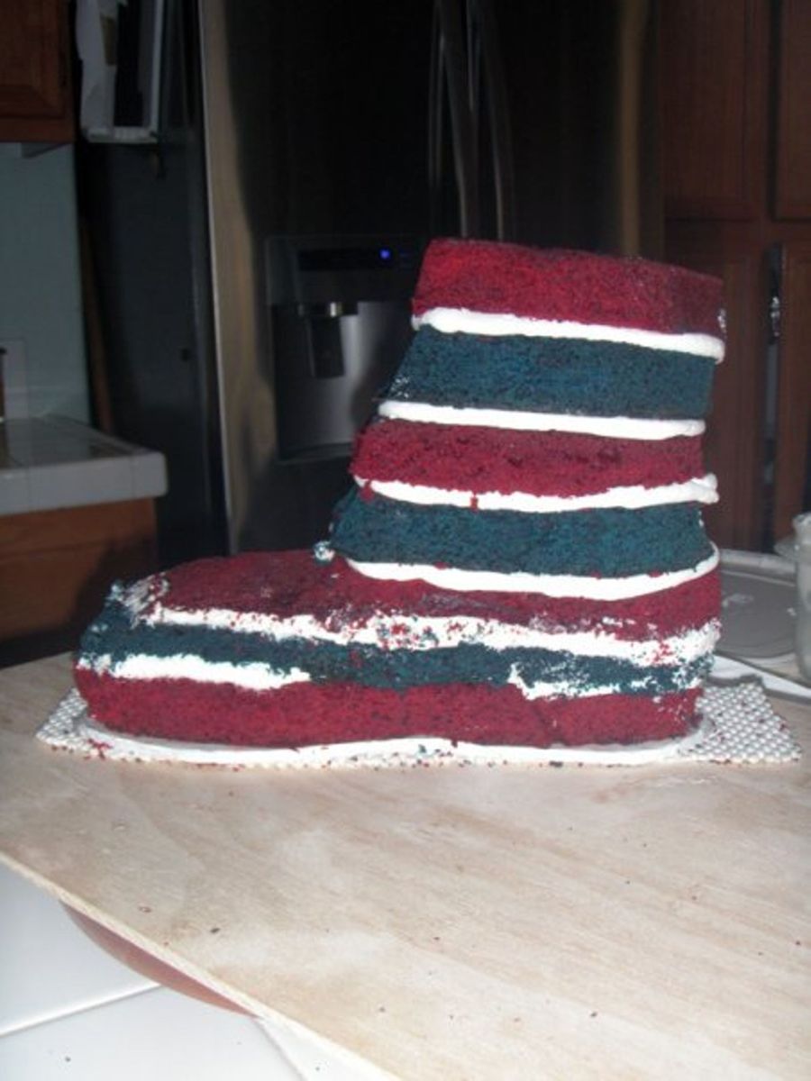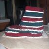 2 carved 10" squares of red and blue velvet cake. Used a texture mat for the shoe's suede leather. All Michelle Foster's fondant.