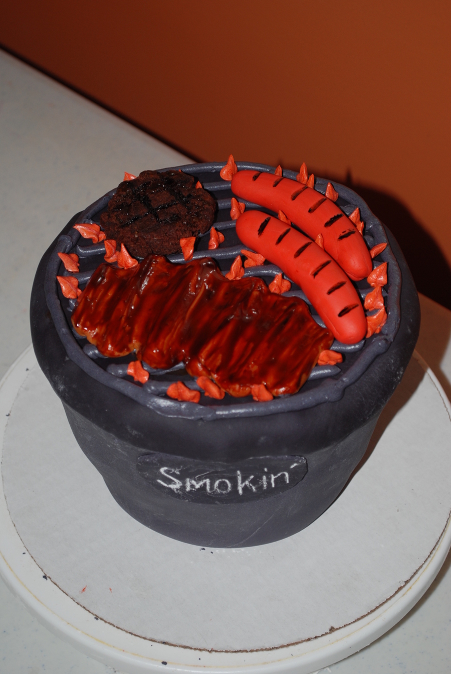 Grill cake with Fondant hot dog, fondant ribs, and brownie hamburger. Grill is yellow cake covered in fondant.