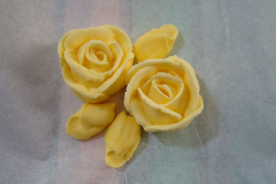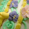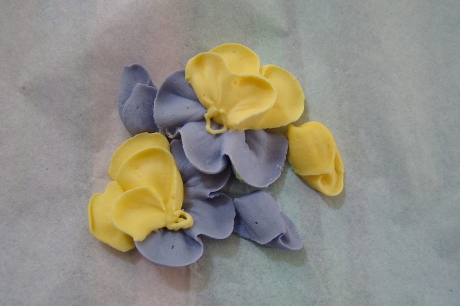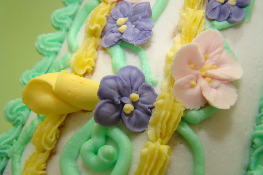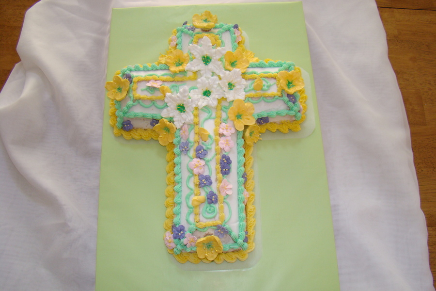 Cross pan, iced and borders done in buttercream, with royal icing flowers. Great for 1st Communion , but possibly adjust the flowers to child's liking.